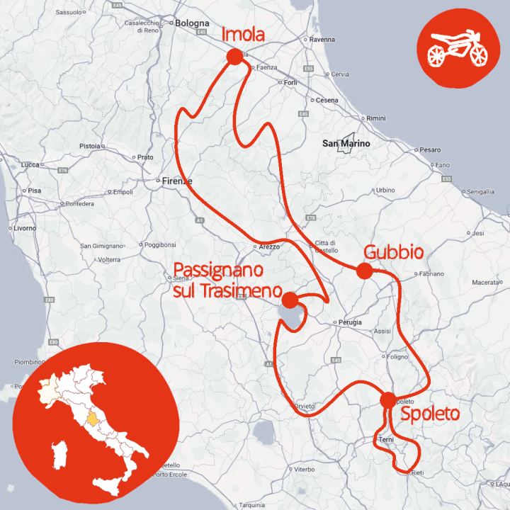 Polmone d'Italia, la verdissima Umbria ci regalerà un itinerario ricco di meraviglia con la natura bellissima e l'armonia dei suoi paesaggi, che si magnificano nelle dolci colline come nelle montagne, dai boschi rigogliosi e dalle ampie vallate disegnate da fiumi e percorse da strade che ricalcano antichi sentieri e che ci porteranno tra laghi e colline punteggiate da borghi, paesi arroccati e castelli. Attraverseremo l'Appennino tosco-romagnolo con i suoi passi leggendari, ci addentreremo nel cuore dei Monti Sibillini per ammirare la spettacolare Piana di Castelluccio, scopriremo la Valnerina e le sue meraviglie naturali, costeggeremo laghi cristallini come quello di Piediluco e Corbara, e ci perderemo tra le strade che collegano gioielli medievali come Gubbio, Spoleto, Todi e Città della Pieve. Un viaggio che alterna curve tecniche a panorami mozzafiato, in pieno stile Giroola.